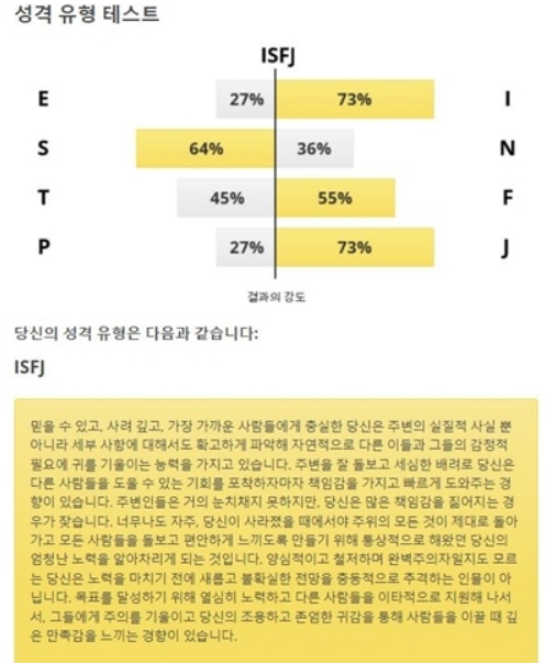 MBTI 무료검사를 마치게 되면 다음과 같이 성격유형 결과가 나타납니다. 또한, 페이지를 내리면 성격유형에 대한 설명과 해당 유형에 속하는 유명인에 대한 정보를 확인하실 수도 있습니다.